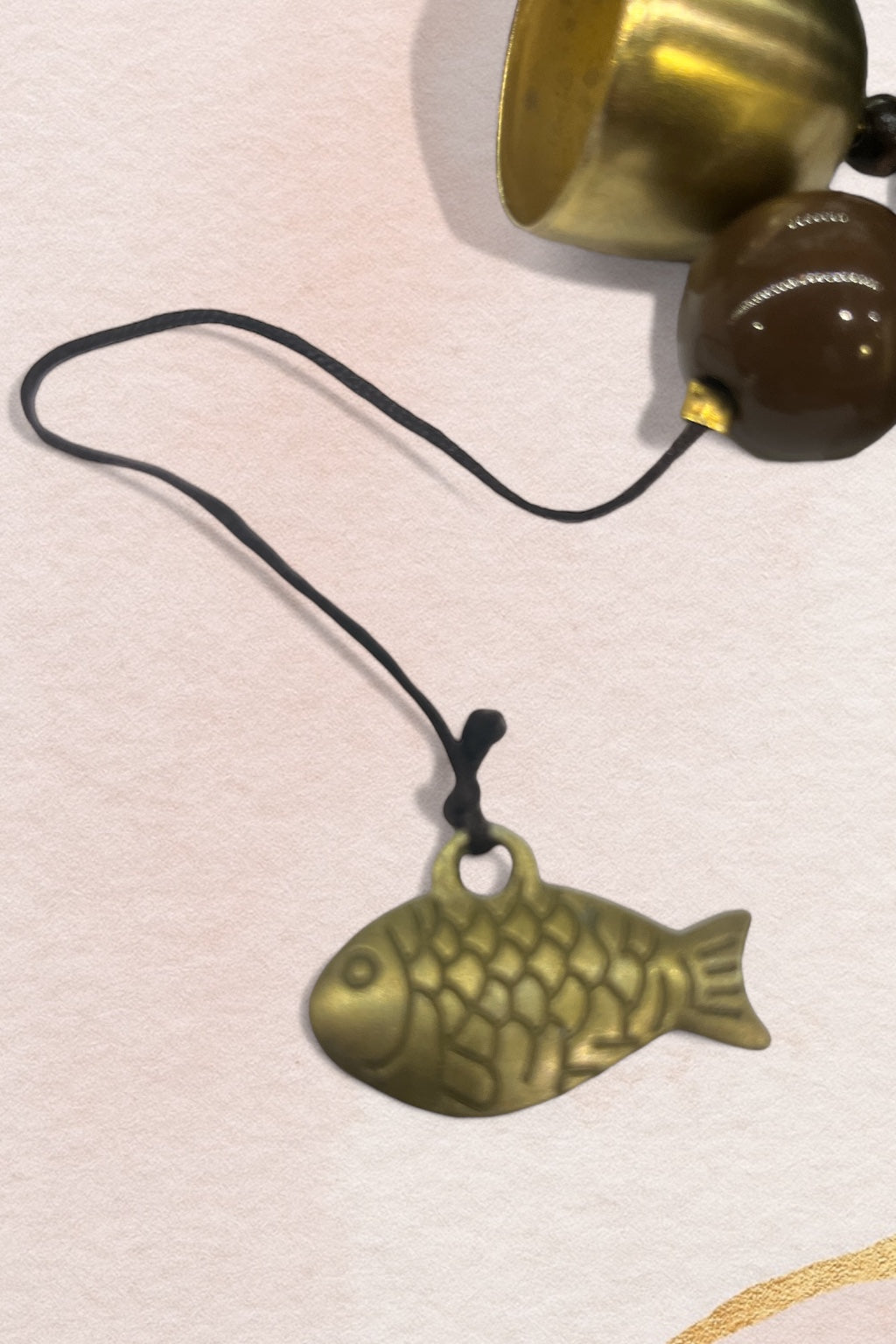 En la parte inferior, el pez colgante representa la prosperidad, la abundancia y la fluidez. En el Feng Shui, el pez es también un símbolo de perseverancia y buena suerte, asociado al éxito en los negocios y a la riqueza que fluye sin obstáculos.