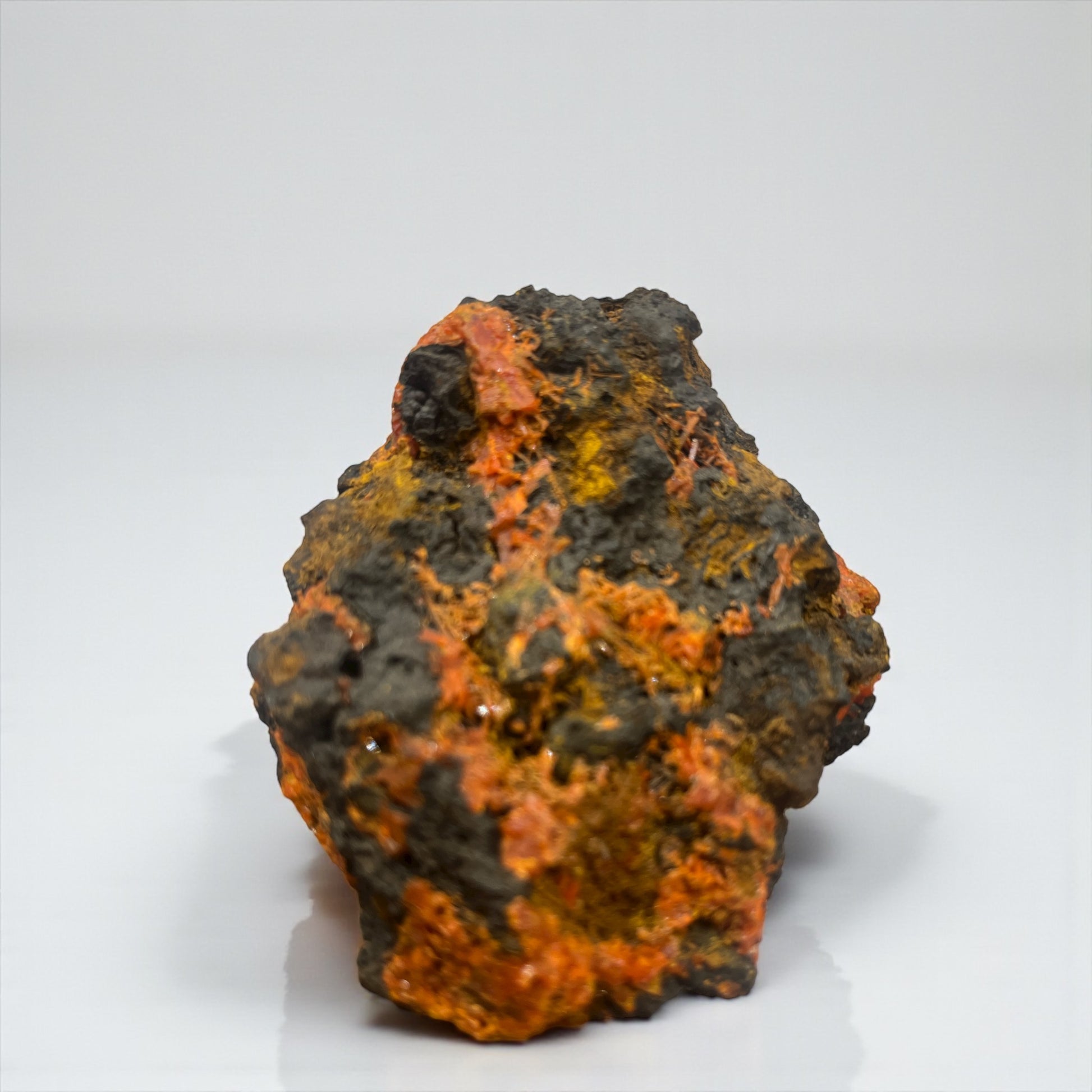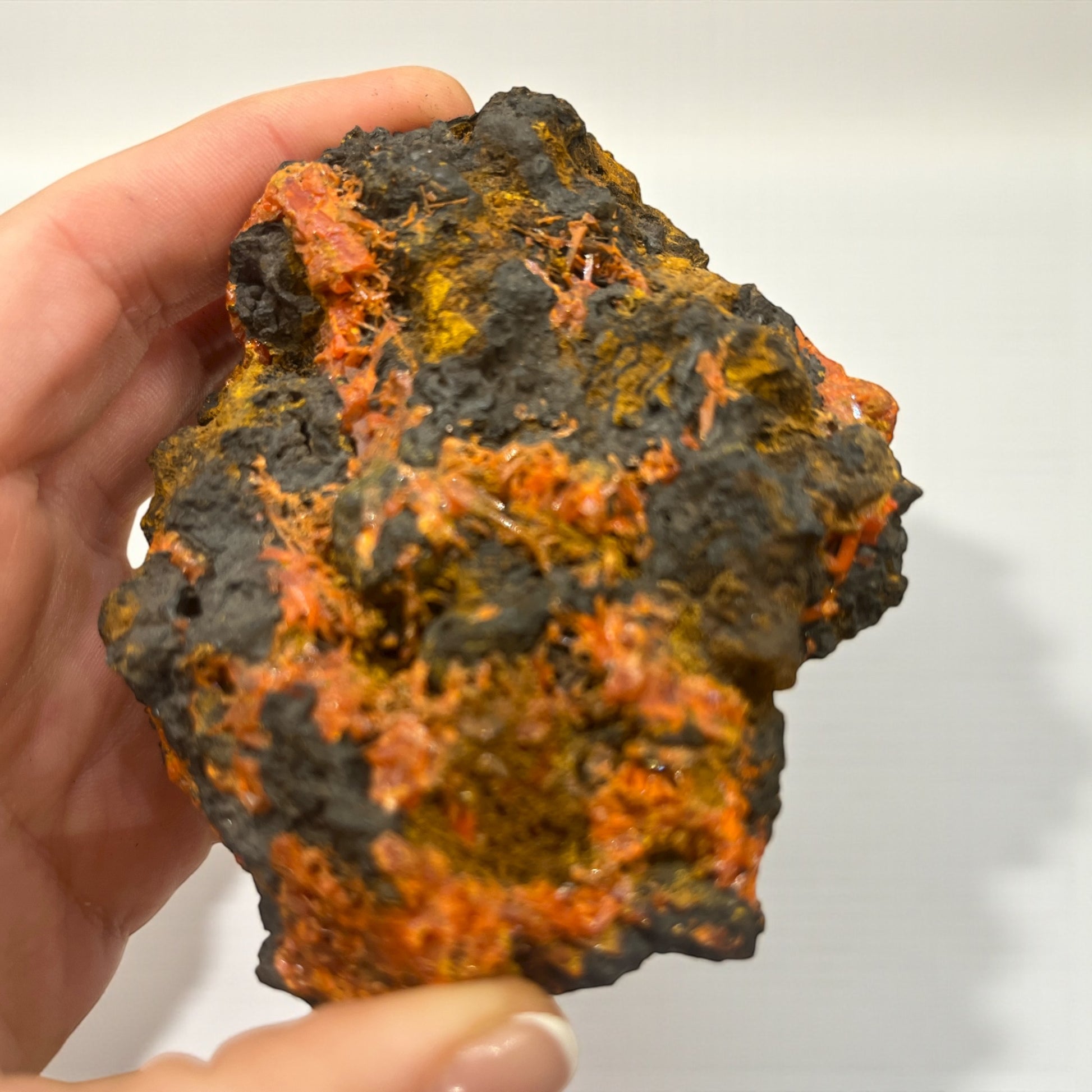 La crocoíta es un mineral de cromato de plomo, cuya fórmula química es PbCrO₄. Se forma en la zona de oxidación de los yacimientos de plomo, como resultado de procesos secundarios donde el cromo y el plomo reaccionan en ambientes ricos en oxígeno y humedad. Su desarrollo cristalino es sumamente atractivo: se presenta en cristales prismáticos alargados, de color rojo anaranjado intenso, a menudo con brillo vítreo y transparencia parcial. Estos cristales suelen crecer sobre matrices oscuras de óxidos de hierro o manganeso, generando contrastes visuales muy característicos. Es un mineral relativamente frágil y escaso, lo que lo convierte en una pieza muy valorada tanto por coleccionistas como por quienes trabajan con su energía. La crocoíta fue descubierta en el siglo XVIII y es conocida por ser el primer mineral natural identificado que contiene cromo, elemento responsable de su color vivo y luminoso.