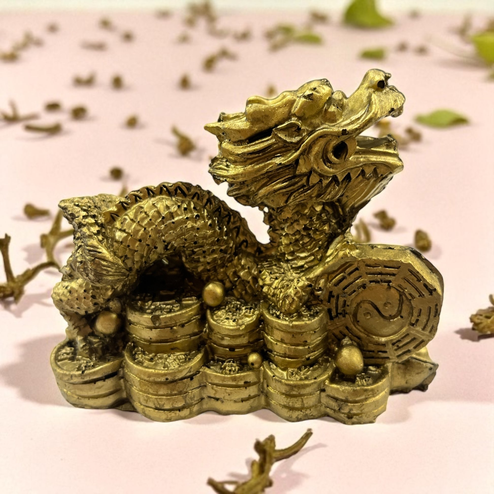 El dragón dorado con monedas es uno de los símbolos más poderosos y auspiciosos dentro del Feng Shui y la mitología oriental. Representa la fuerza vital o Chi, la energía que da vida y movimiento al universo. Su presencia simboliza el poder, la protección y la prosperidad, atrayendo buena fortuna y equilibrio energético a los espacios donde se coloca.