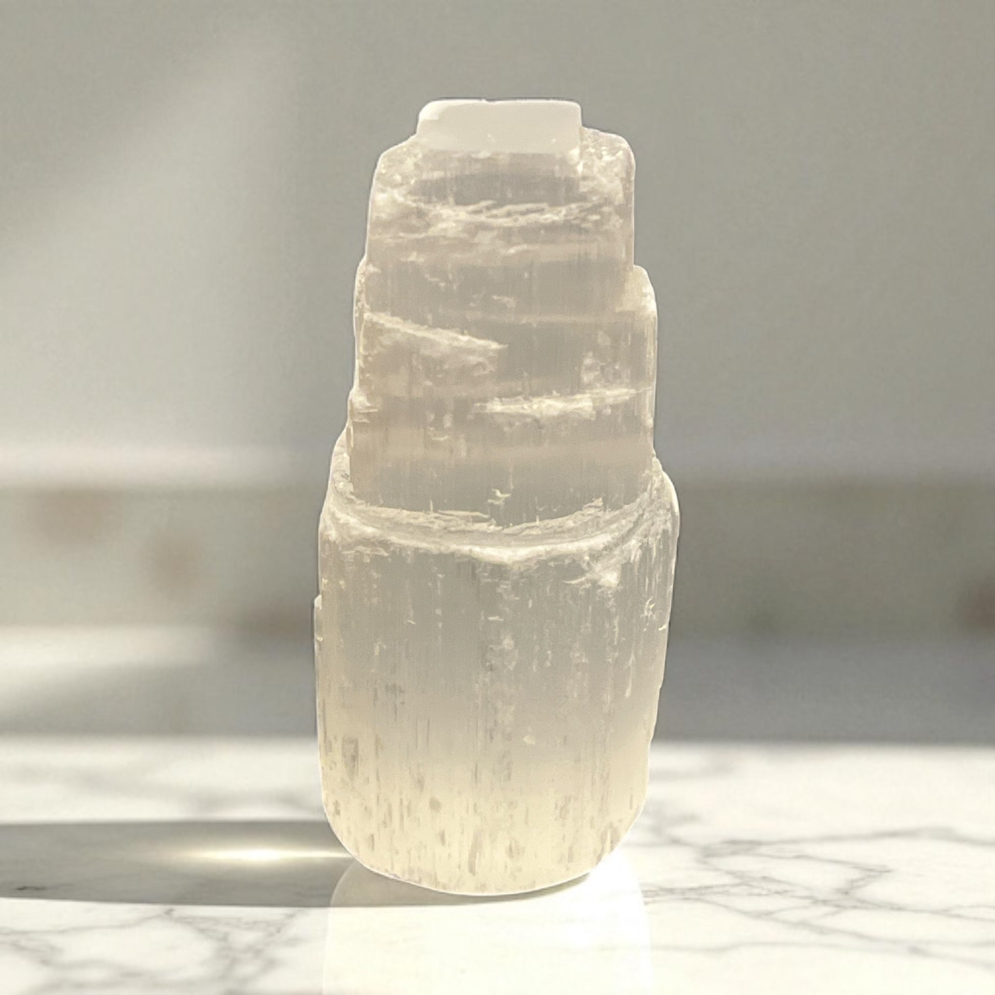 Con un bloque grande de selenita como éste, puedes colocar la piedra afectada encima del bloque durante la noche para recargarla.