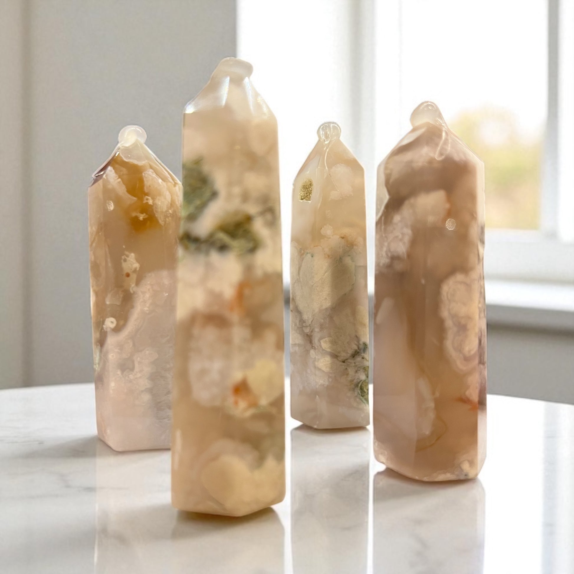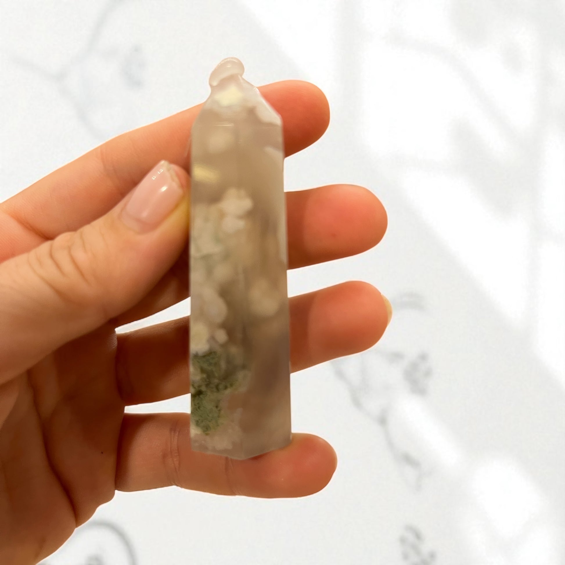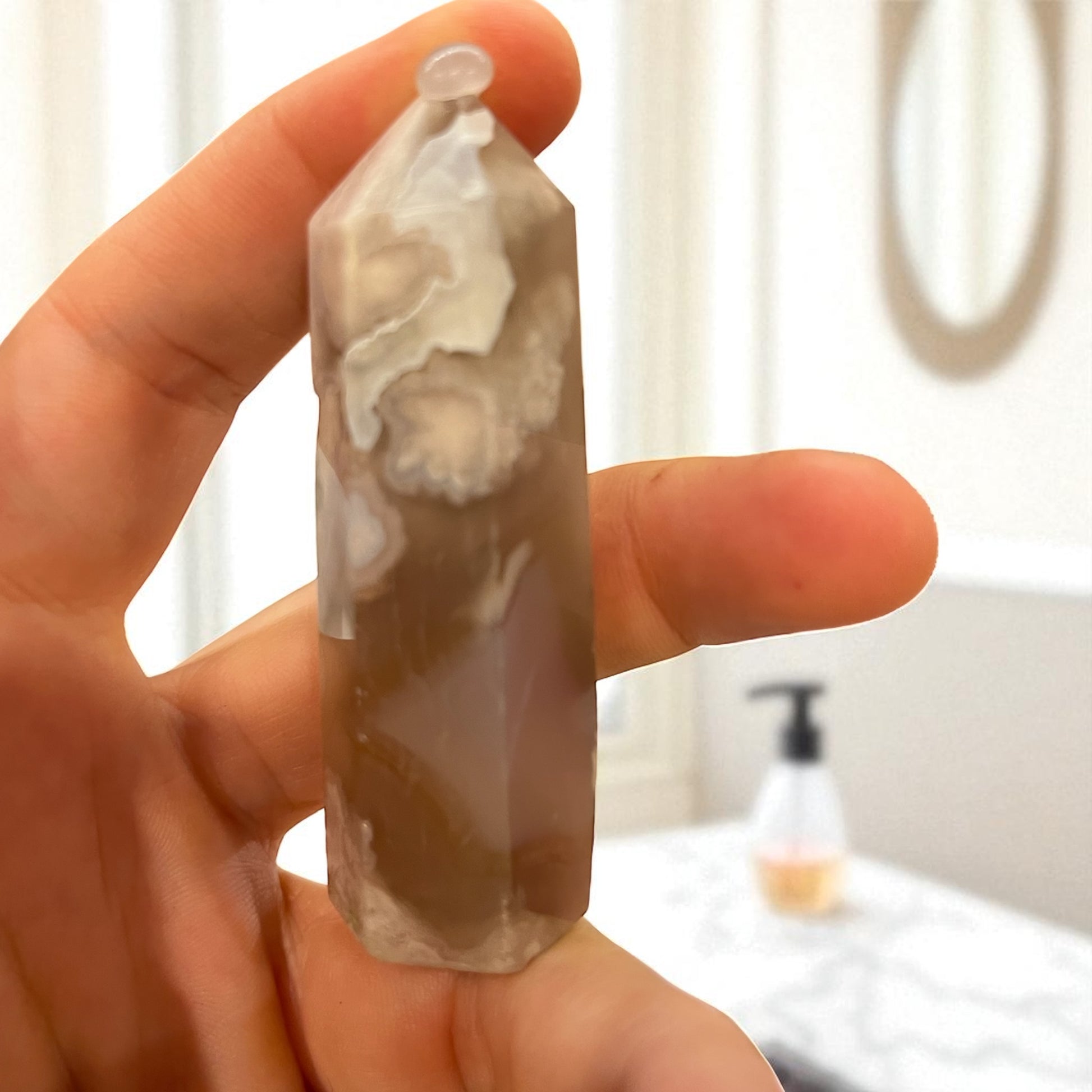 El ágata es ligeramente protectora cuando es oscura. Pero en este caso al ser de unos tonos tan suaves y esos desarrollos en forma de flor aporta calma, claridad mental, relajación tanto así que se me antoja poner una en mi mesita de noche.