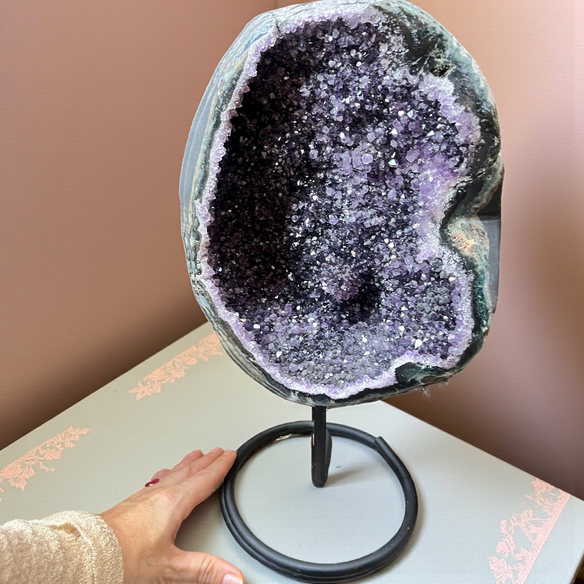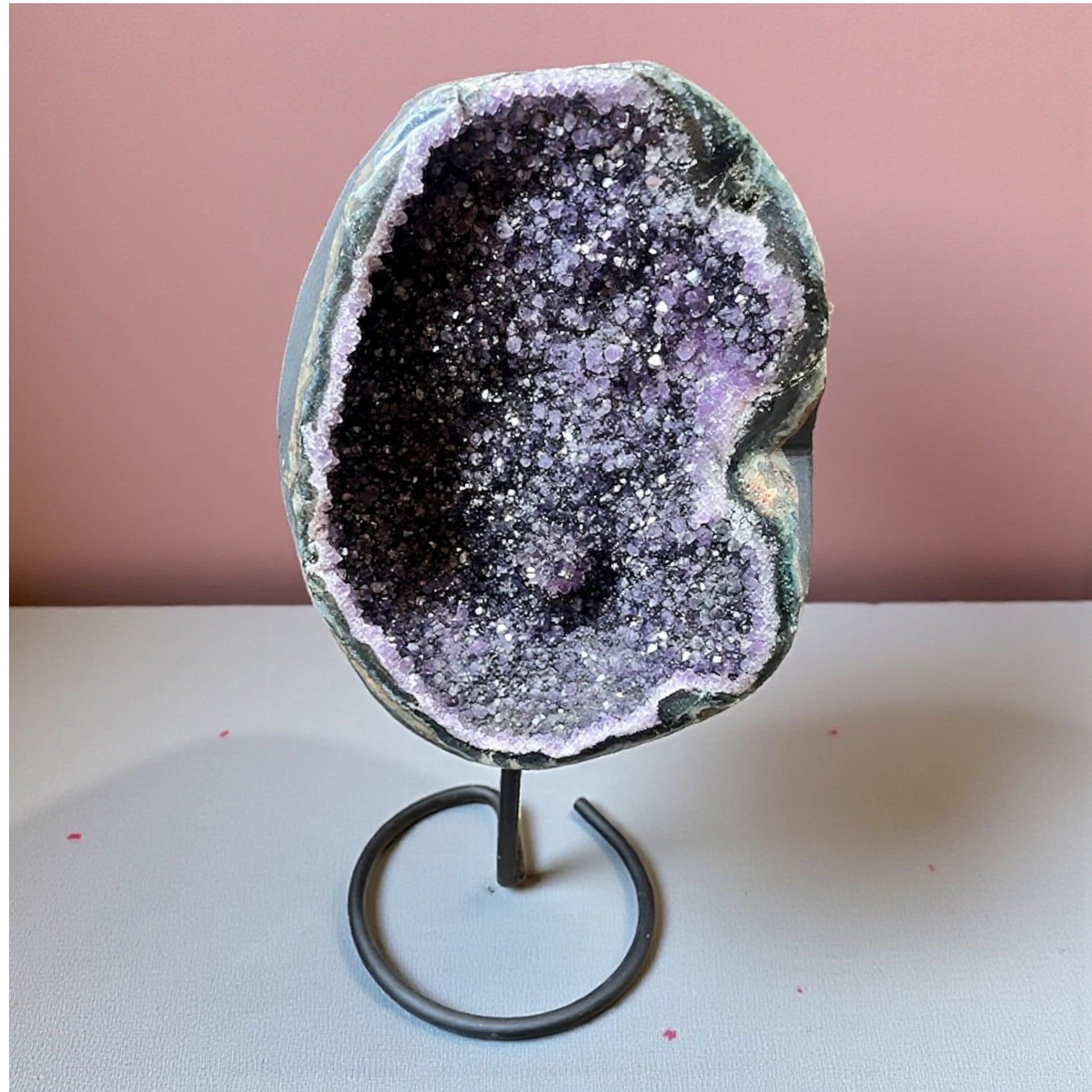 Esta espectacular pieza de amatista destaca por su color violeta profundo y por la presencia de puntas bien formadas, lo que realza su belleza natural y potencia sus cualidades energéticas. Montada sobre una elegante peana, es perfecta para decorar y armonizar cualquier espacio.