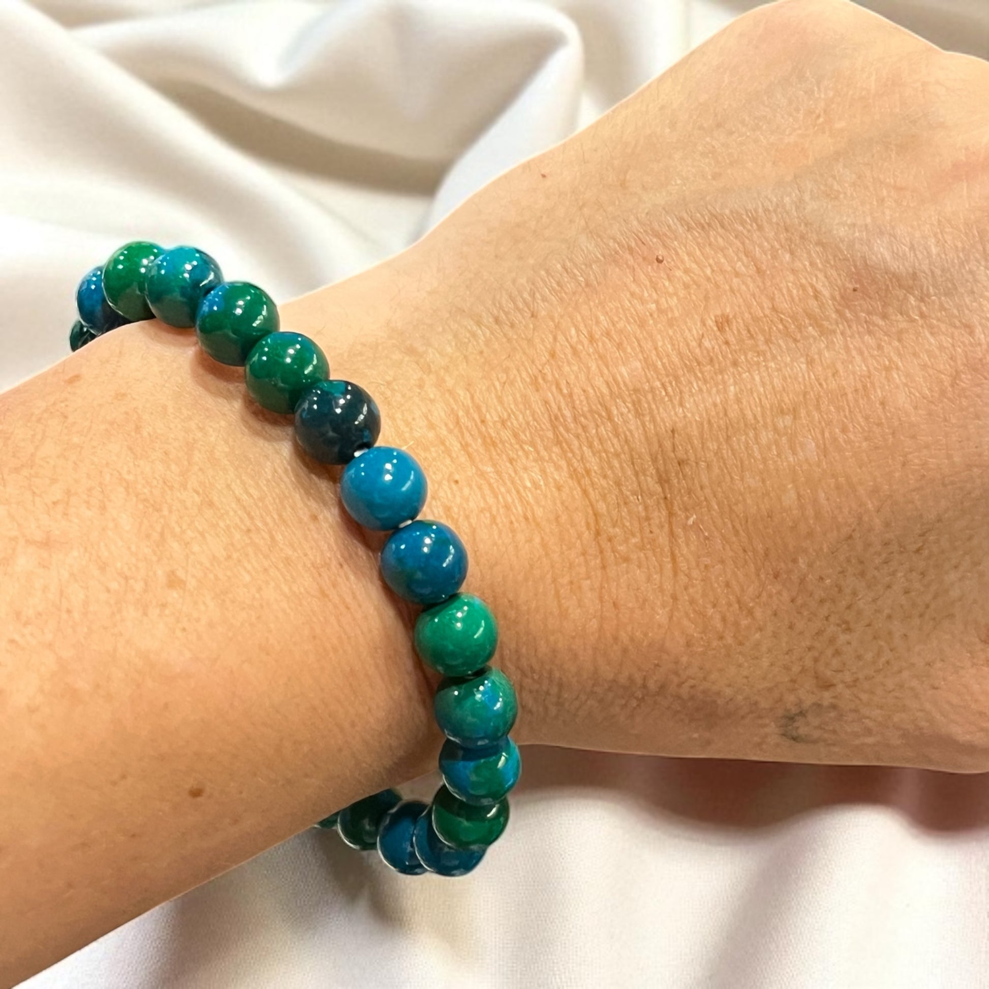 Se dice que la crisocola reduce la presión sanguínea, fortalece la tiroides y es benéfica para el metabolismo. Es una piedra excelente para las mujeres, pues trata el síndrome premestrual y suaviza los calambre y dolores.