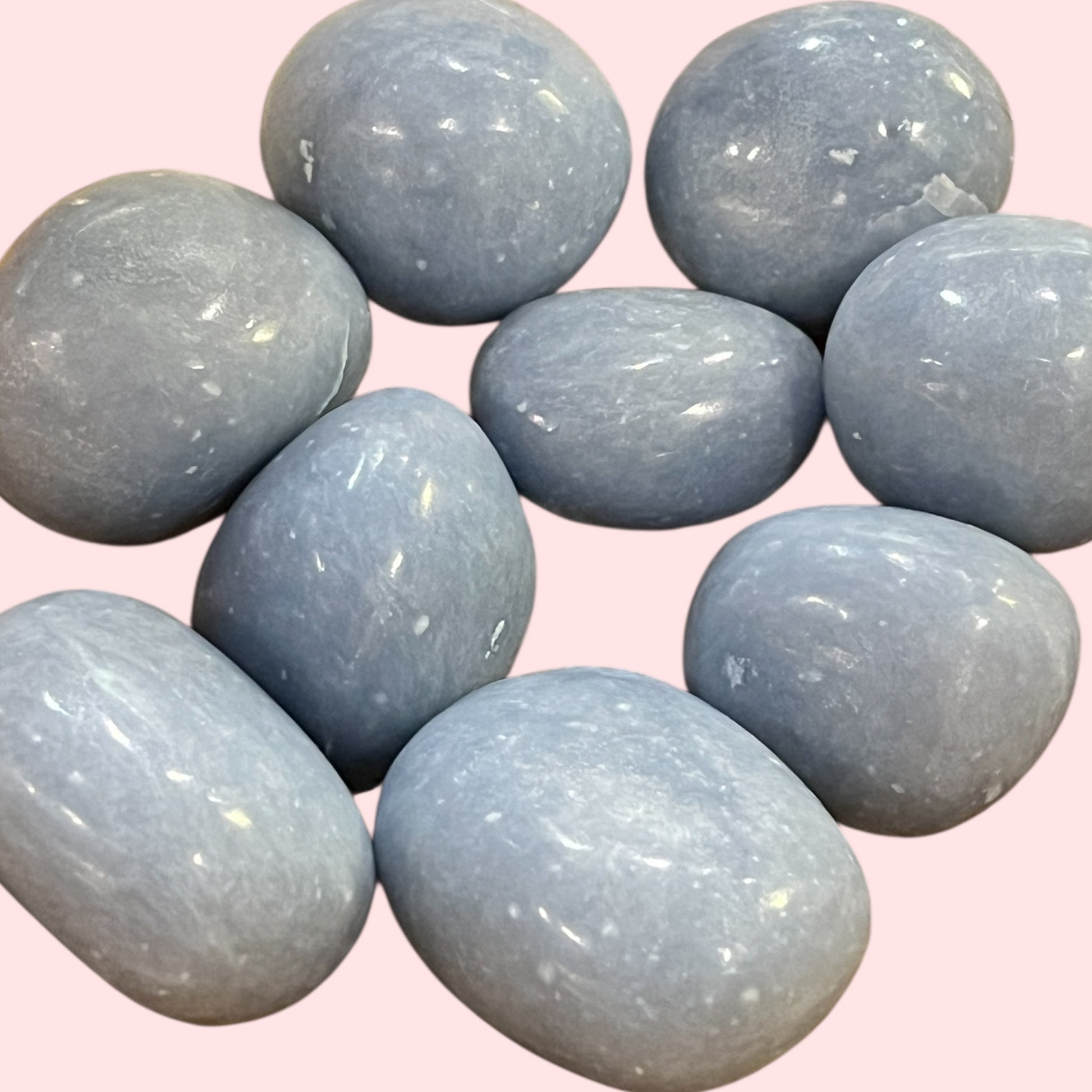La angelita es la forma masiva del mineral anhidrita, un sulfato de calcio que se presenta en tonos celestes suaves debido a pequeñas inclusiones y a su estructura cristalina compacta. Se forma por la deshidratación natural de la yeso en ambientes evaporíticos y suele aparecer en vetas y nódulos de aspecto sedoso y homogéneo. Con una dureza de 3 a 3,5 en la escala de Mohs, es un mineral relativamente frágil que requiere cuidados especiales: puede rayarse con facilidad y no debe exponerse al agua, ya que la humedad favorece su transformación nuevamente en yeso. Su brillo es mate a ligeramente nacarado y su fractura es irregular, características que le confieren ese aspecto suave y delicado tan apreciado en gemoterapia.