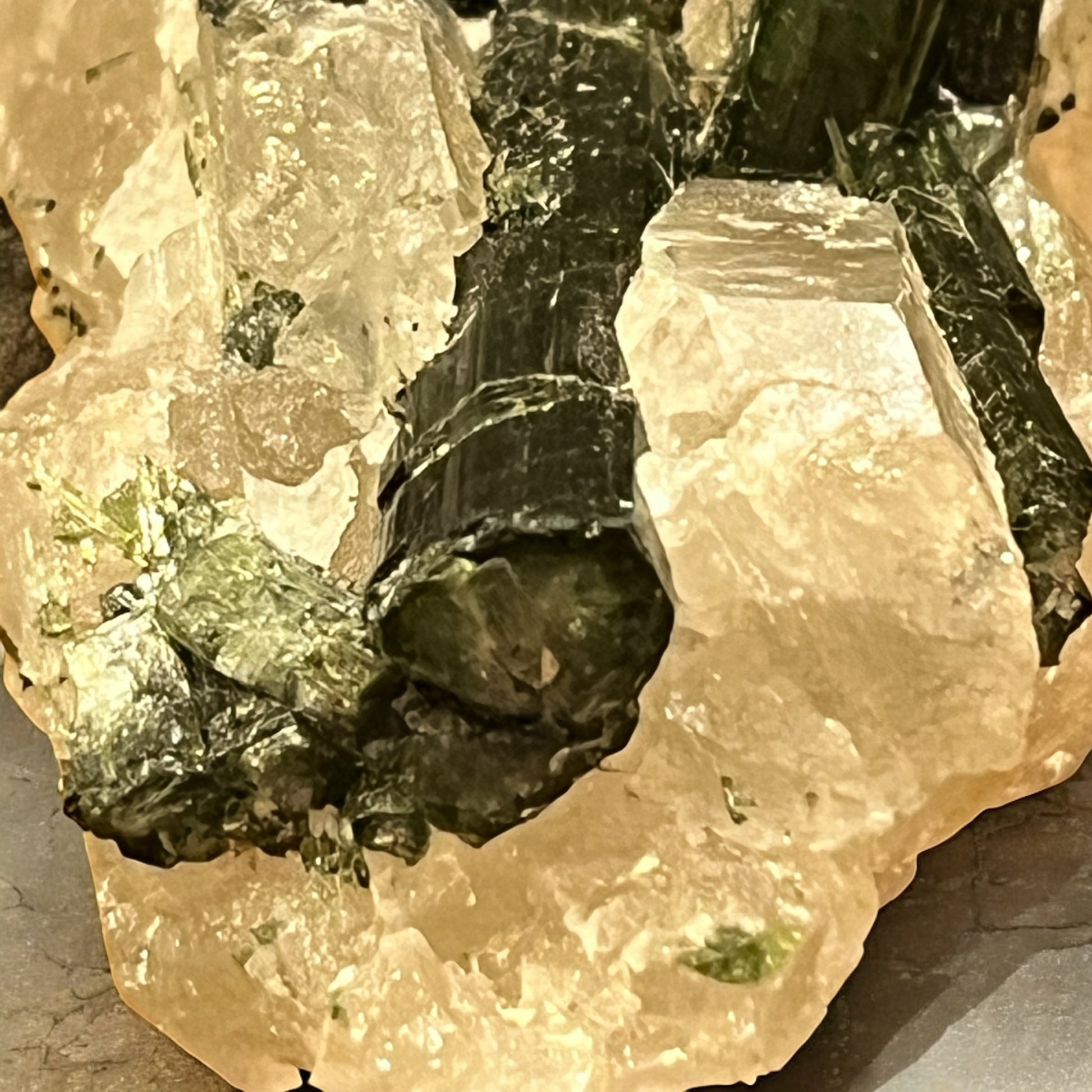 Desde el punto de vista mineralógico, la presencia de cuarzo ahumado como base es significativa, ya que esta variedad de cuarzo debe su coloración a la radiación natural y la presencia de trazas de aluminio. Se forma en ambientes ricos en sílice y su combinación con la turmalina verde ocurre en condiciones geológicas de alta temperatura y presión, como en pegmatitas y zonas hidrotermales.