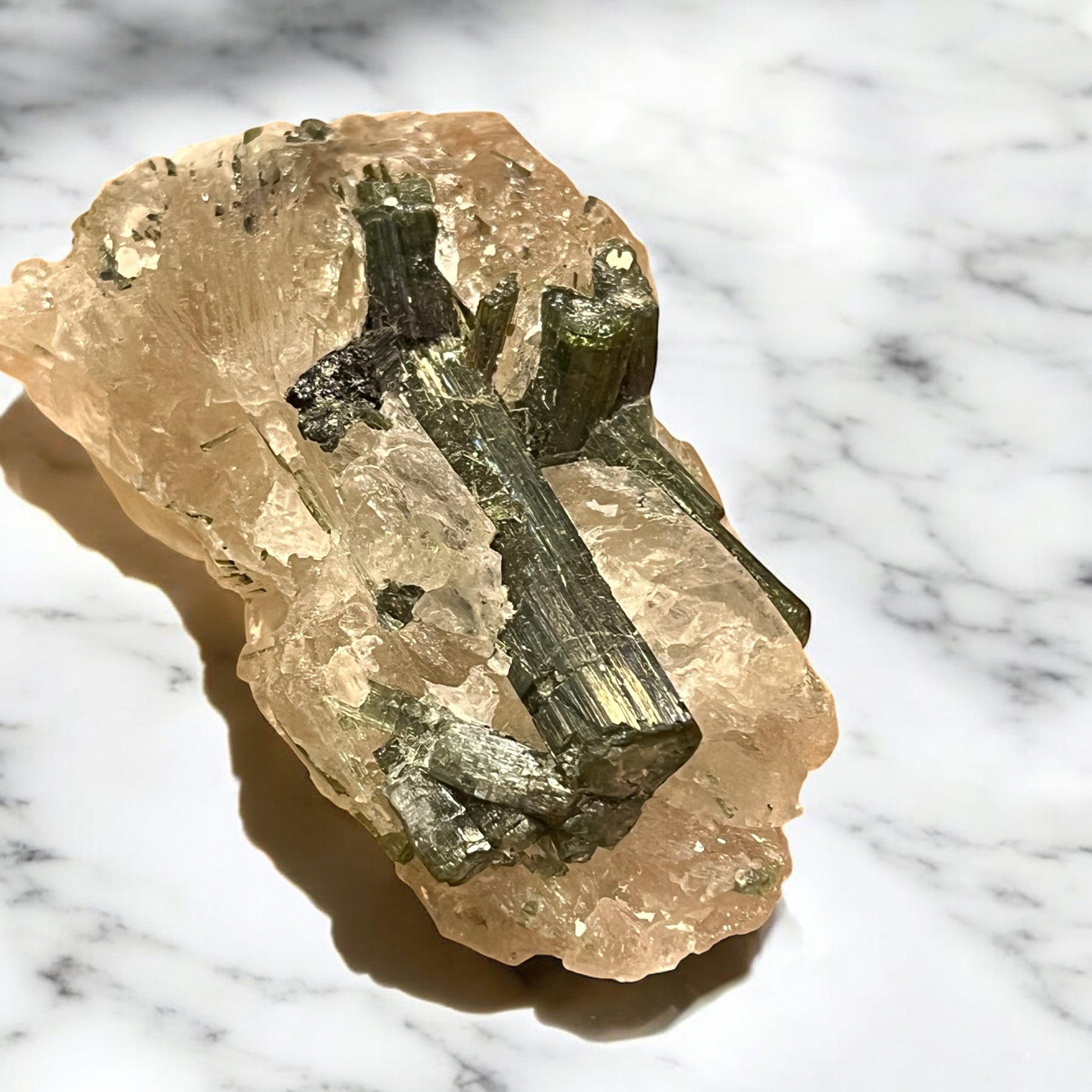 La turmalina verde, también conocida como verdelita, es una variedad del grupo de las turmalinas, un silicato complejo de boro y aluminio con estructura trigonal. Su color verde se debe a la presencia de hierro, cromo o vanadio, y suele presentarse en cristales prismáticos, alargados y con estrías longitudinales. Esta pieza en particular se encuentra sobre matriz natural de cuarzo ahumado, lo que intensifica sus propiedades tanto mineralógicas como energéticas.